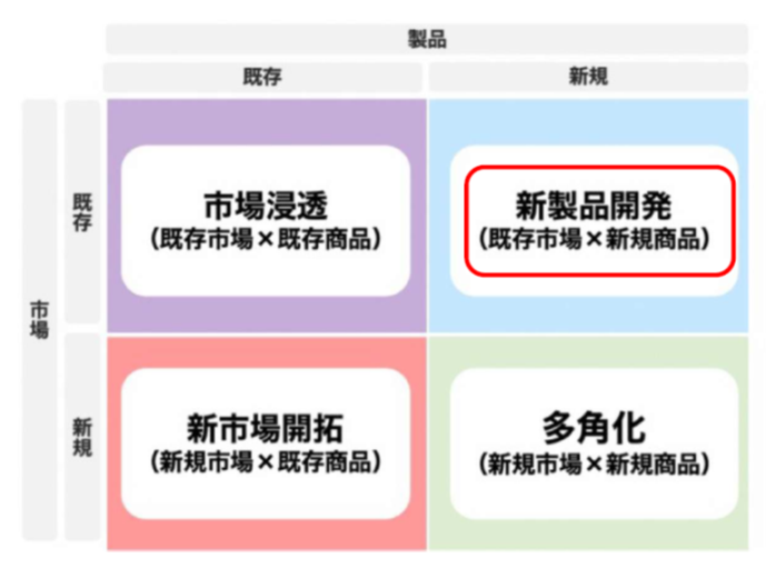 既存市場に新製品を投入する戦略。新しい機能を付加して旧商品と入れ替える、既存商品のバリエーションを追加する、といった方法がある。自動車市場のモデルチェンジや「〇〇エディション」をイメージすればよい。企業は当該市場のことは熟知しており、これまでの製品について顧客のフィードバックも得ているため、比較的成功確率が高いと言われている。