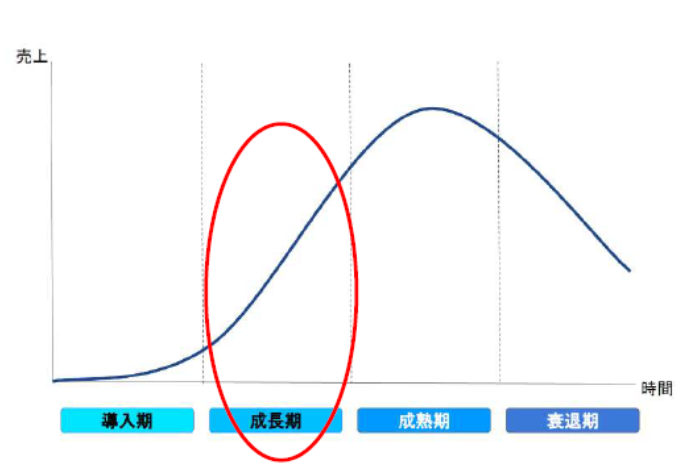 導入期を無事乗り越え、売上高が急激に伸び始める時期。引き続き販管費はかさむが、累積生産量の増加に伴い生産コストは下がり始める。顧客は比較的早い段階で新商品に興味を持つ層(アーリーアダプター)であるが、市場の成長に伴い徐々に競合との競争関係も激しくなっていく。キャッシュフローはまだマイナスであることが多く、PPMではこの時期の製品・サービスを「問題児」または「花形」と位置づける。