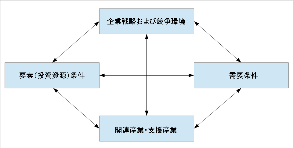 ポーターが提唱した地域と産業の関係を示すフレームワークである。以下の4つの要素が共振することにより、イノベーションが活発化し、国や地域の競争優位につながっていく。